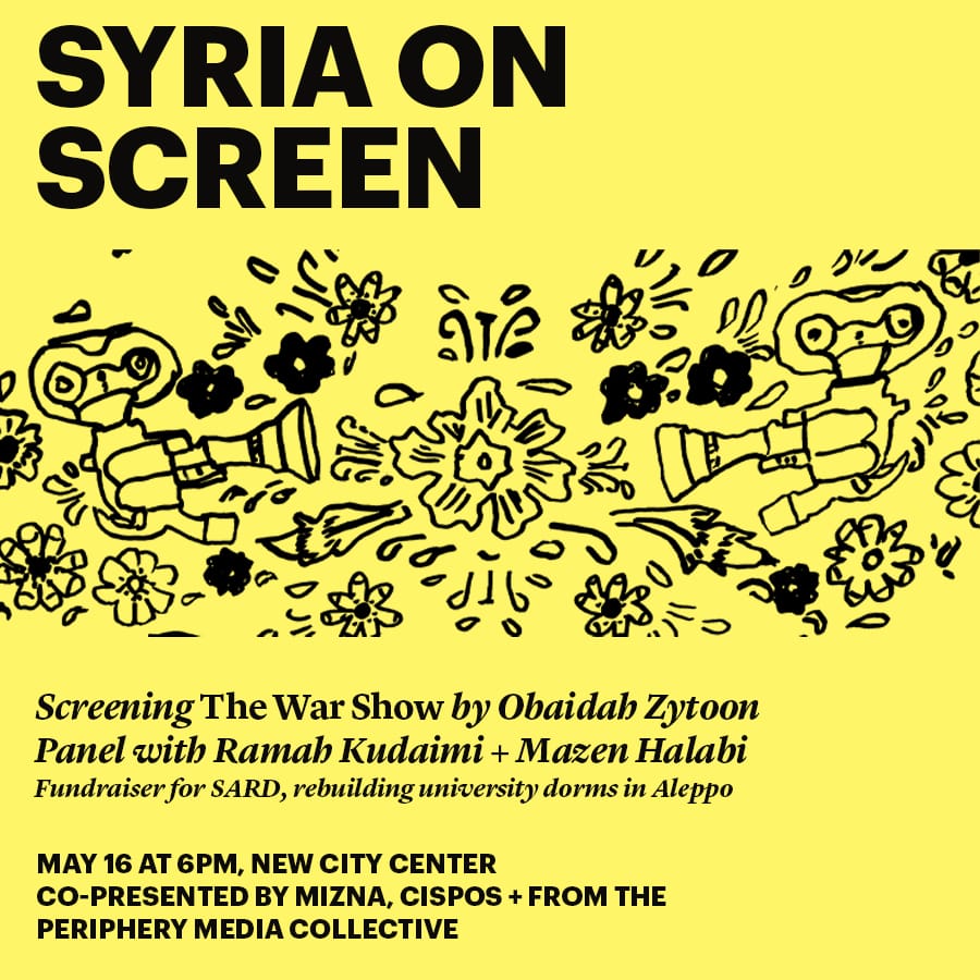 Shoutout to my friend Aydin, who is organizing this event. Co-presented by Mizna, the Committee in Solidarity with the People of Syria (CISPOS), and From the Periphery Media Collective, join us for a screening of The War Show (2016) by Obaidah Zytoon and post-screening discussion with Ramah Kudaimi and Mazen Halabi. This event aims to provide space for our local community to learn about and process the recent events in Syria. Donations at the event go to SARD’s project to rebuild university dorms in Aleppo, Syria. When: 6:00–9:00 PM (reception with light refreshments at 6:00 PM; film starts at 6:30 PM; discussion at 8:15 PM) Where: New City Center (Sanctuary), 3104 16th Ave S. Minneapolis, MN 55407. Panelists: Ramah Kudaimi and Mazen Halabi
